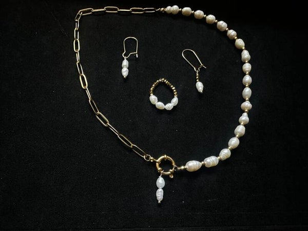 Klasyka w nowoczesnym wydaniu. Naturalne perły słodkowodne połączone ze złotymi detalami tworzą zestaw, który przyciąga uwagę, ale nadal pozostaje subtelny i elegancki.